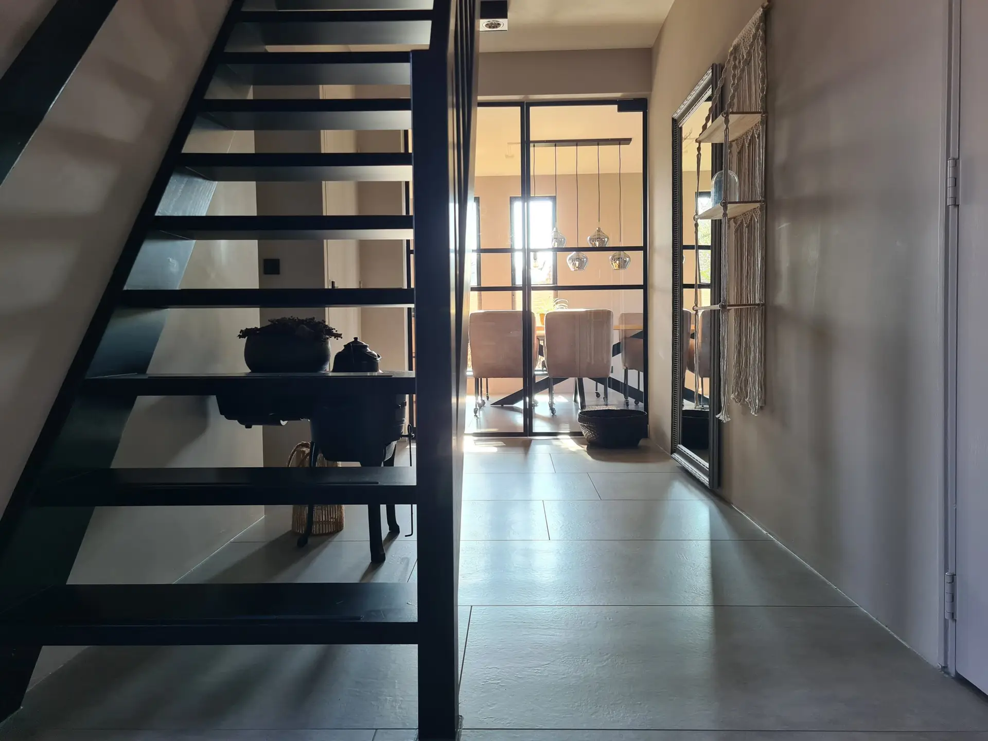 Taatsdeuren van keuken naar de hal en zwarte open trap